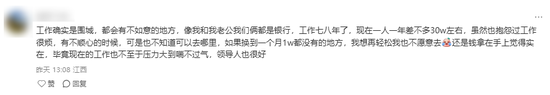 正如某社交平台上有网友表示,“工作确实是围城,都会有不如意的地方,像我和我老公我们俩都是银行,工作七八年了,现在一人一年差不多30w左右,虽然也抱怨过工作很烦,有不顺心的时候,可是也不知道可以去哪里,如果换到一个月1w都没有的地方,我想再轻松我也不愿意去,还是钱拿在手上觉得实在,毕竟现在的工作也不至于压力大到喘不过气,领导人也很好。”